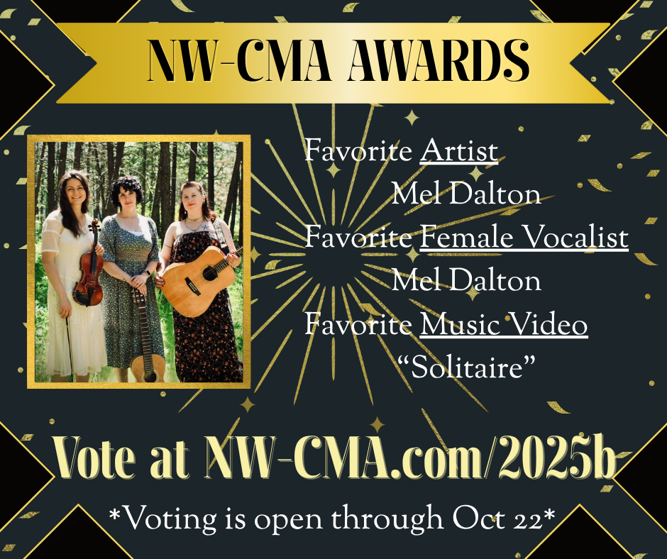 It’s NW-CMA awards season again, and I thank you for all your support! Y’all showed up and I’ve received three nominations this year - for Favorite Local Act, Favorite Female Vocalist, and Favorite Music video!